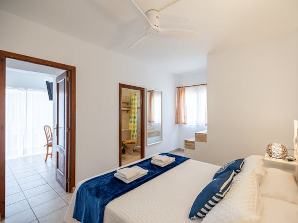 For the most demanding gests, our Superior Suite located facing the commercial street, has a large balcony, a separate bedroom with a double bed and en-suite bathroom and a living-dining room with a fully equipped electric kitchen and bar.