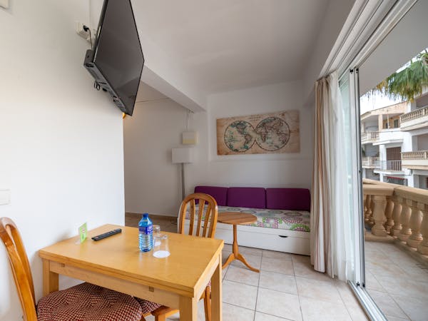 It consists of a separate bedroom with a double bed and en-suite bathroom and a spacious living-dining room with a fully equipped electric kitchen.